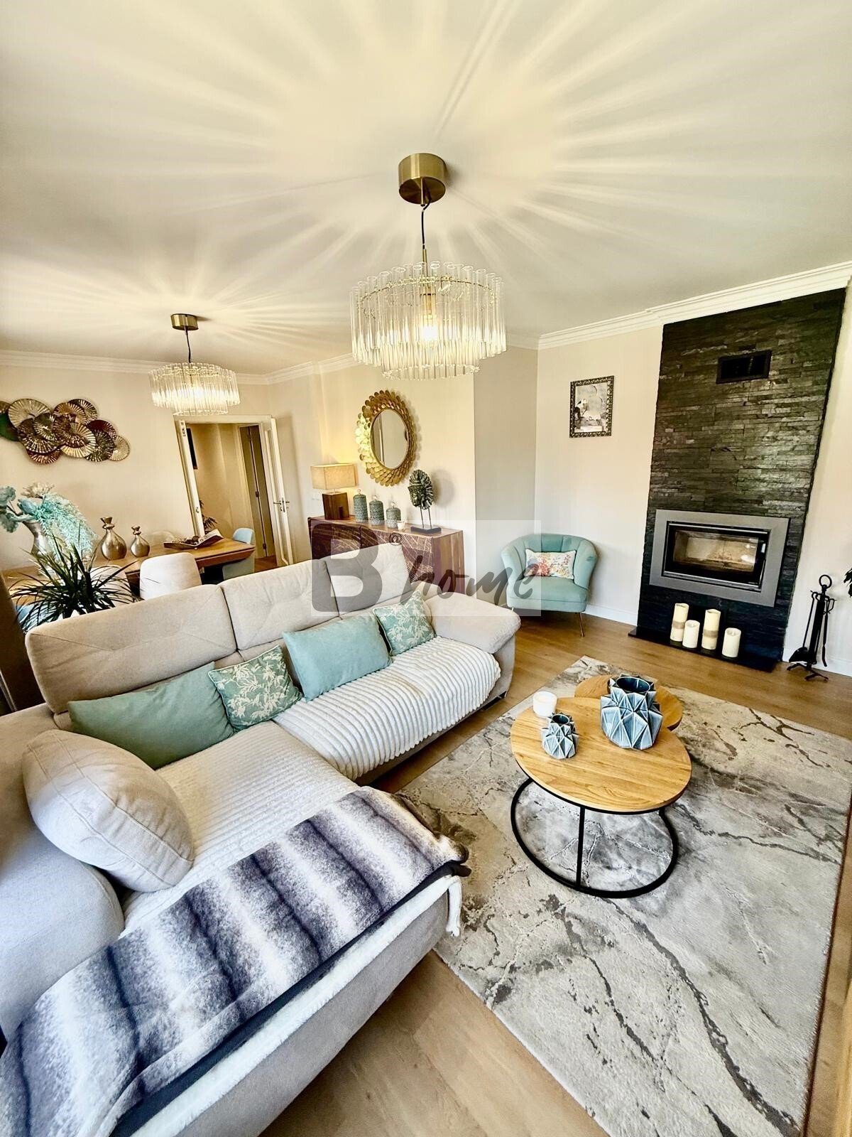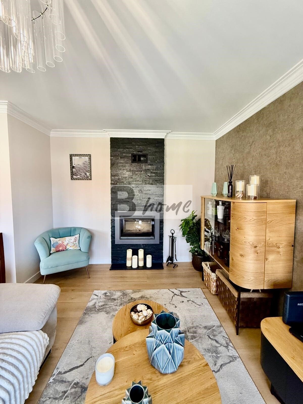 Uma sala luminosa com lareira e recuperador de calor, perfeita para momentos de lazer e convívio.